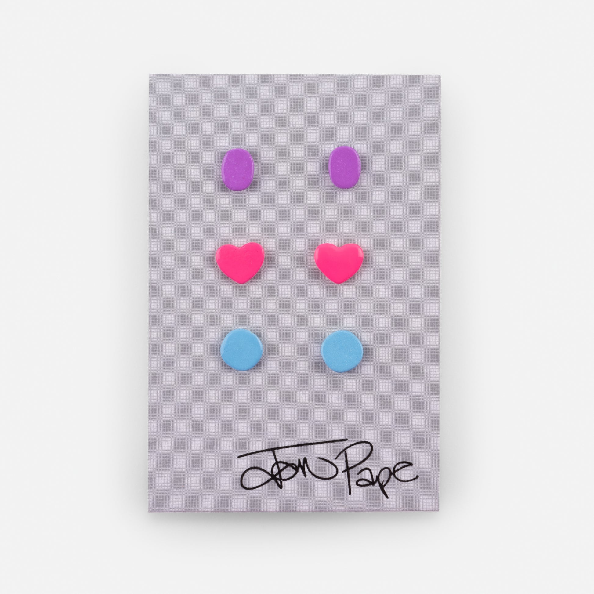 Set of 3 earrings based on stick-on earring shapes in assorted colors, includes oval, heart, and circle sets. All earrings are hand-dipped polyester powder coated steel earrings with surgical stainless steel posts and sterling silver backings. Each of the neon colors are black light reactive.