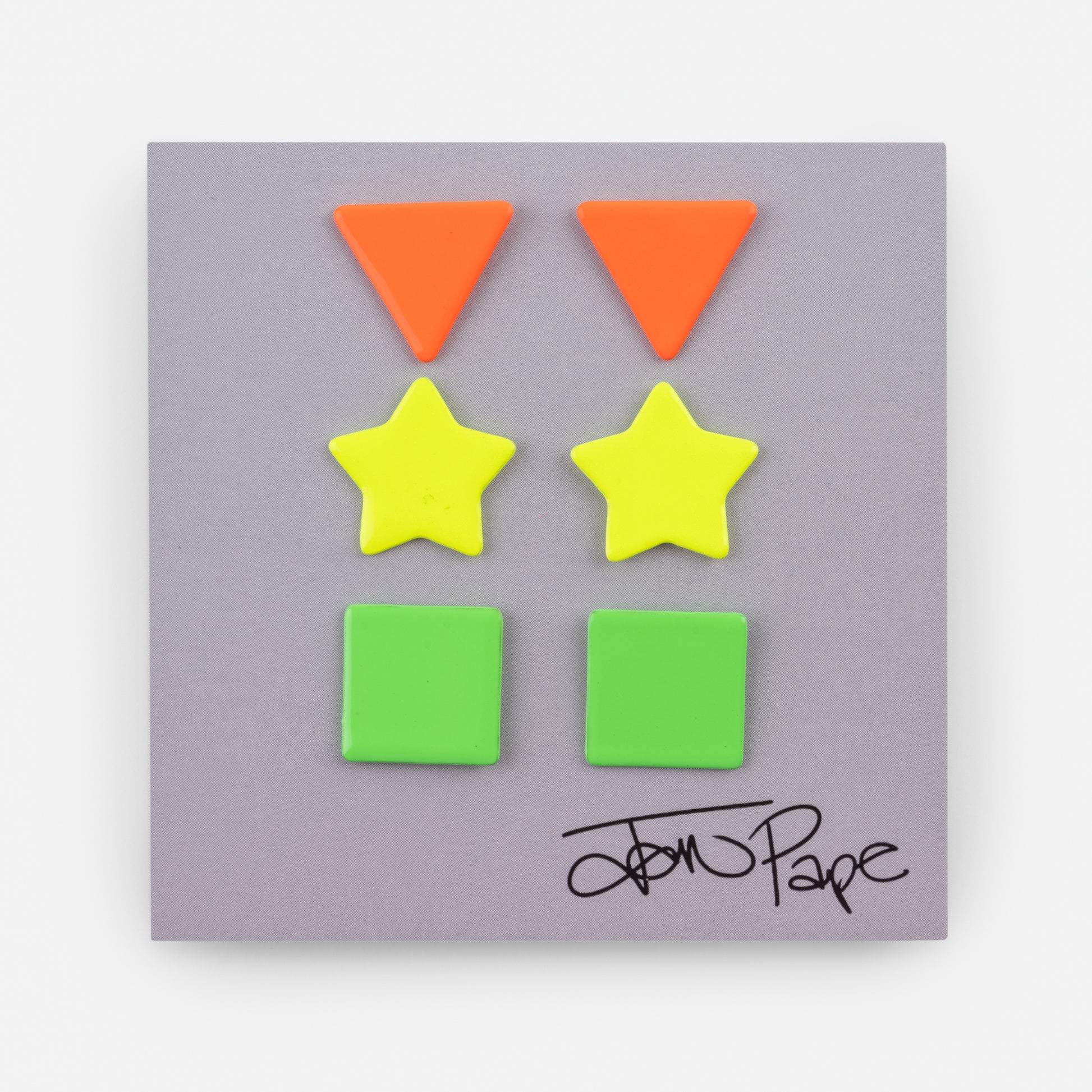 Set of 3 earrings based on stick-on earring shapes in assorted colors, includes a triangle, star, and square set. All earrings are hand-dipped polyester powder coated steel earrings with surgical stainless steel posts and sterling silver backings. Each of the neon colors are black light reactive.
