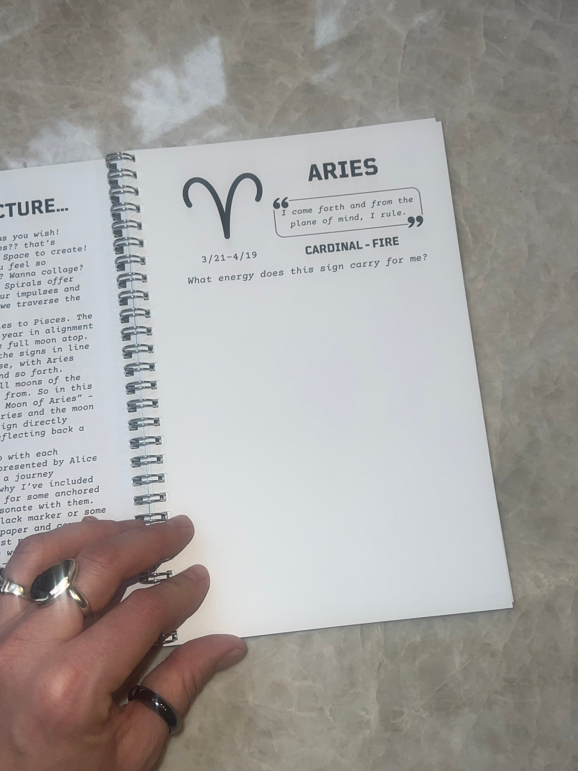 Instead of taking in a book full of content - what if you yourself create one filled with that which resonates and inspires you? This 6x9 spiral bound journal with heavy weight pages allows for you to do just that! Each sign has 4 pages: one with basic information on the sign and seed thought - with space for you to fill in key words, images, doodles, or what have you's that YOU YOURSELF connect with the sign; one for the new moon; one for the full moon within that sign; and one for reflection. All with basic prompts and space for you to quickly note what is arising for you.