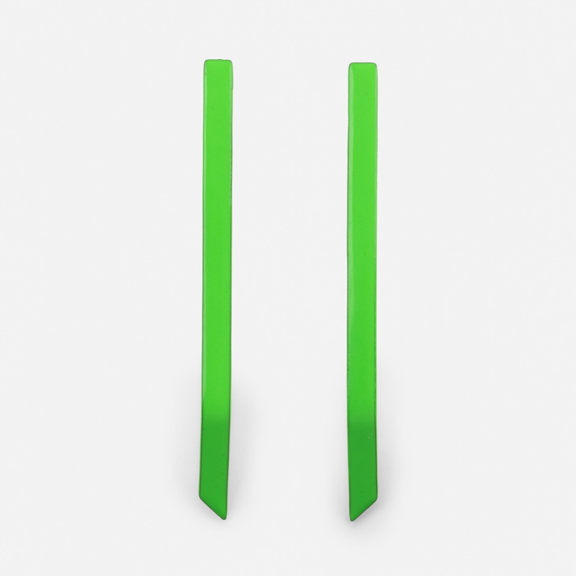 Polyester powder coated steel with surgical steel posts and nickel-free sterling bullet shape backings. This neon green powder coat is black light reactive!