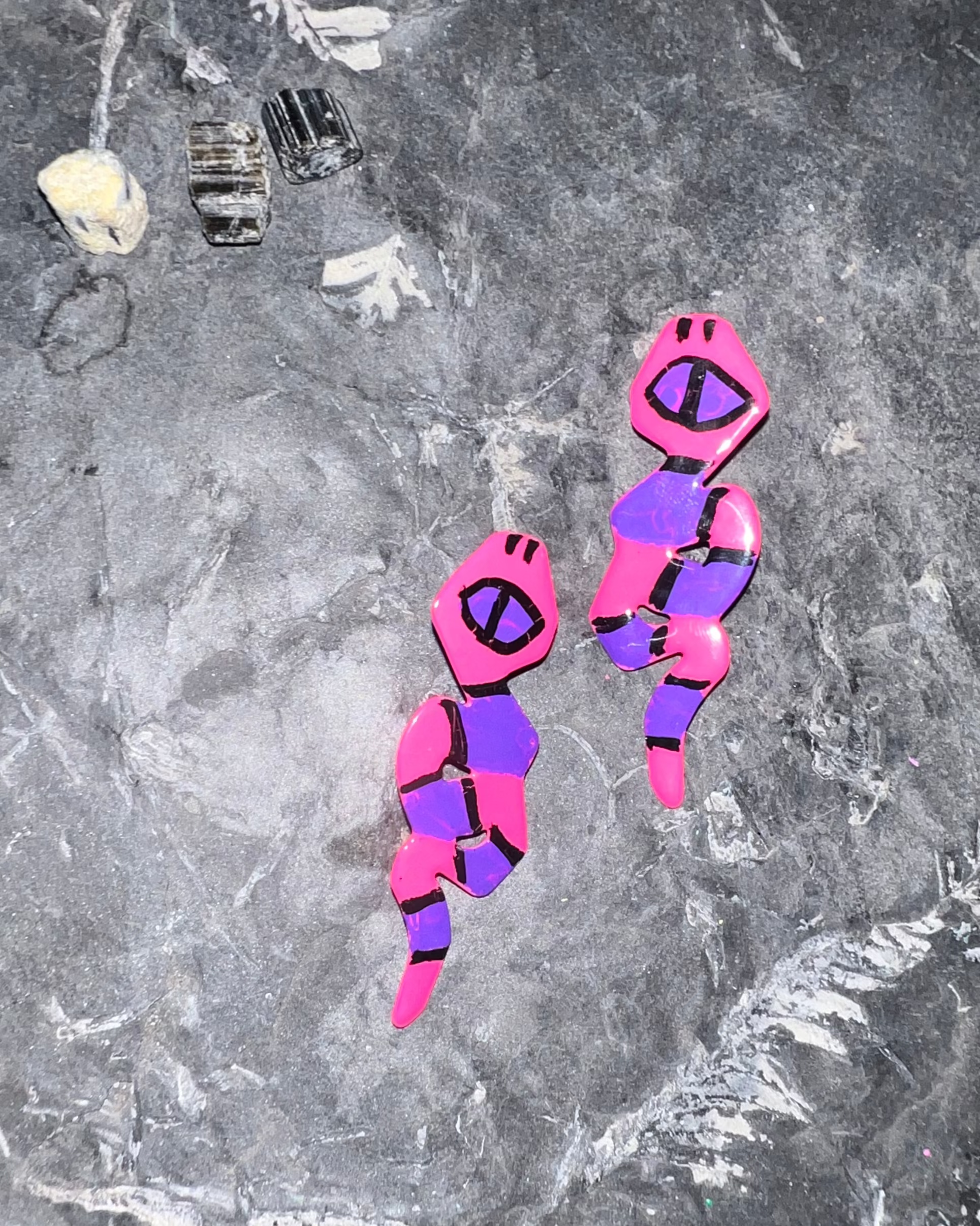 One of one of this friendly set! Each pair is hand-dipped and hand painted polyester powder coated steel earrings with surgical stainless steel posts and sterling silver backings.