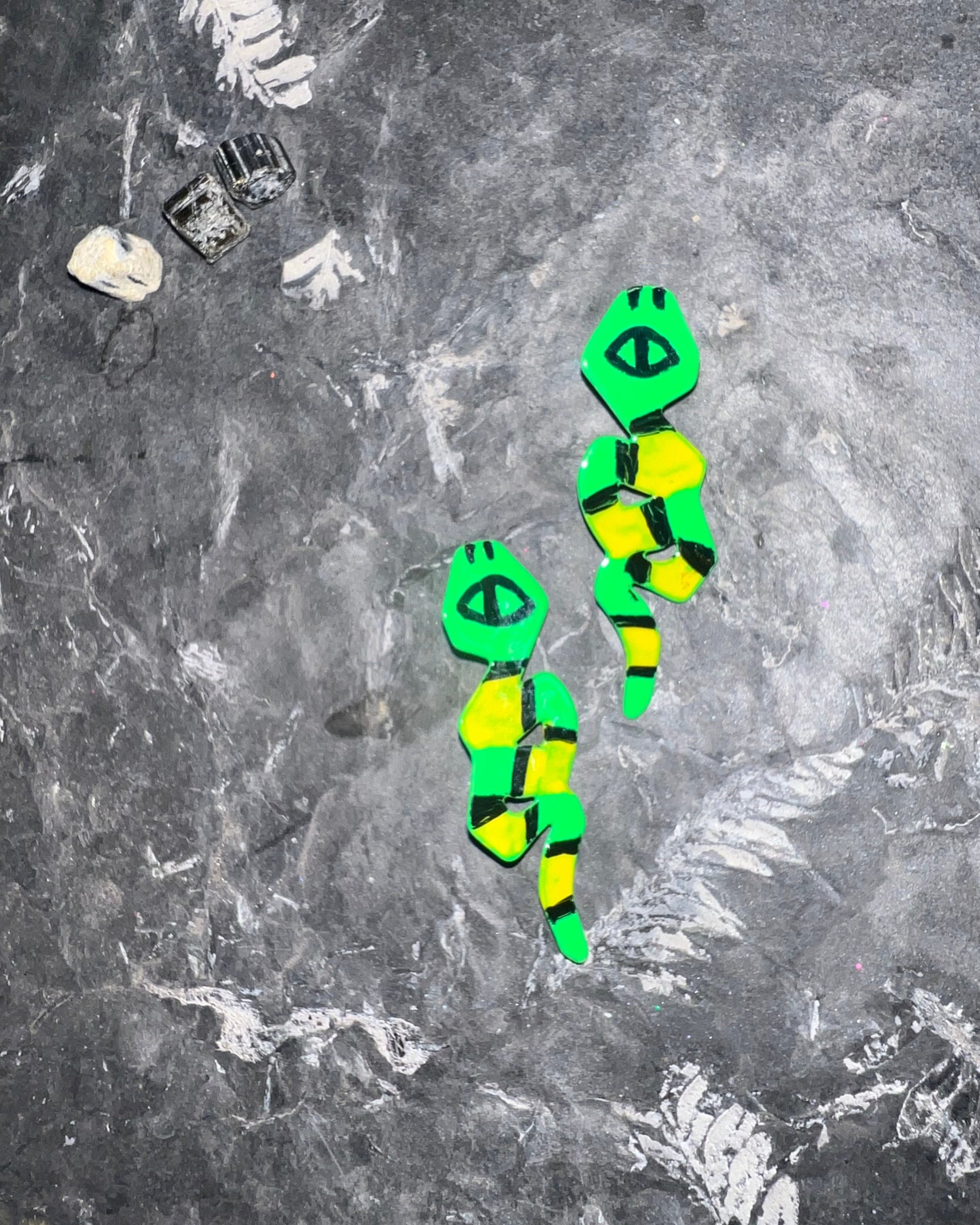 One of one of this friendly set! Each pair is hand-dipped and hand painted polyester powder coated steel earrings with surgical stainless steel posts and sterling silver backings.