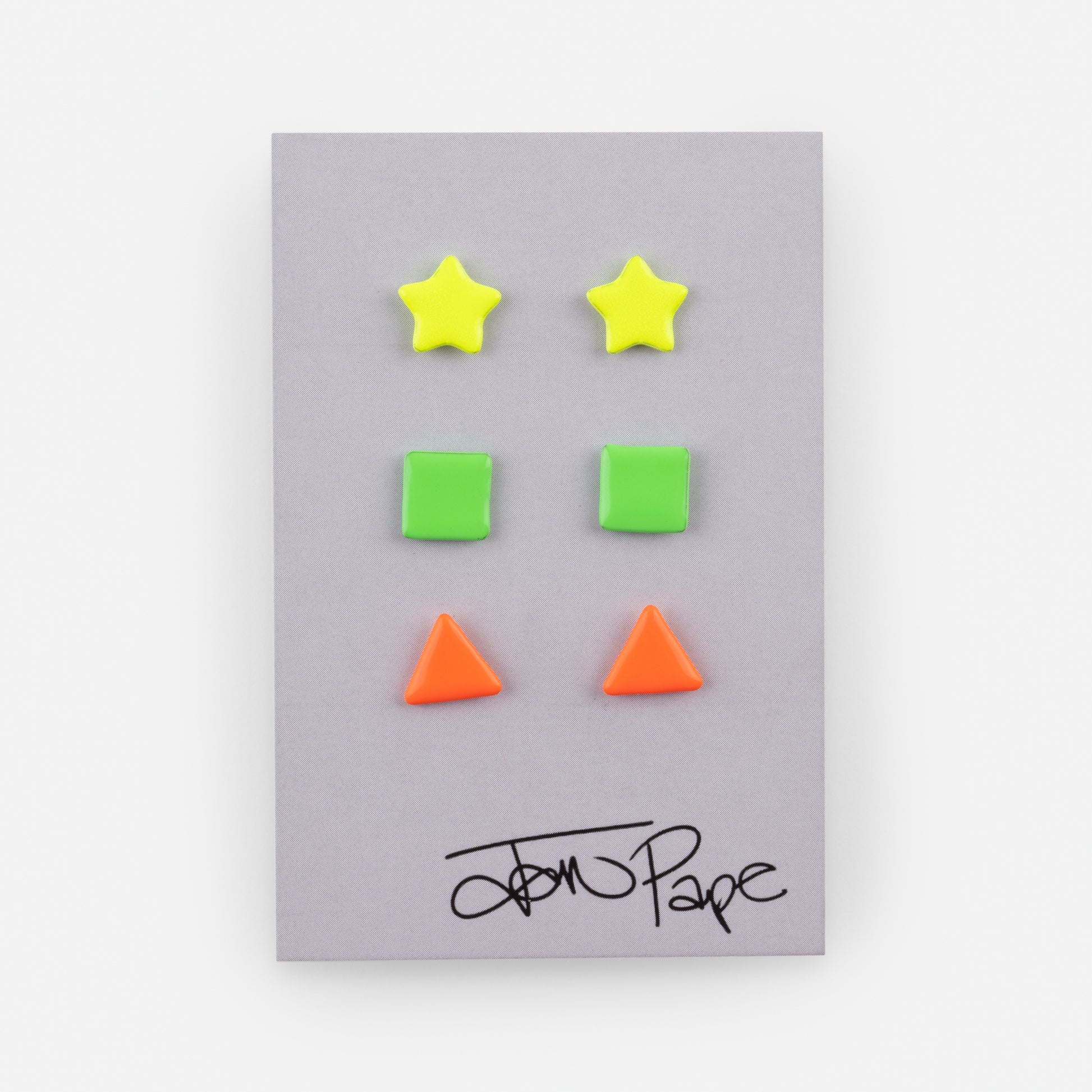 Set of 3 earrings based on stick-on earring shapes in assorted colors, includes a triangle, star, and square set. All earrings are hand-dipped polyester powder coated steel earrings with surgical stainless steel posts and sterling silver backings. Each of the neon colors are black light reactive.