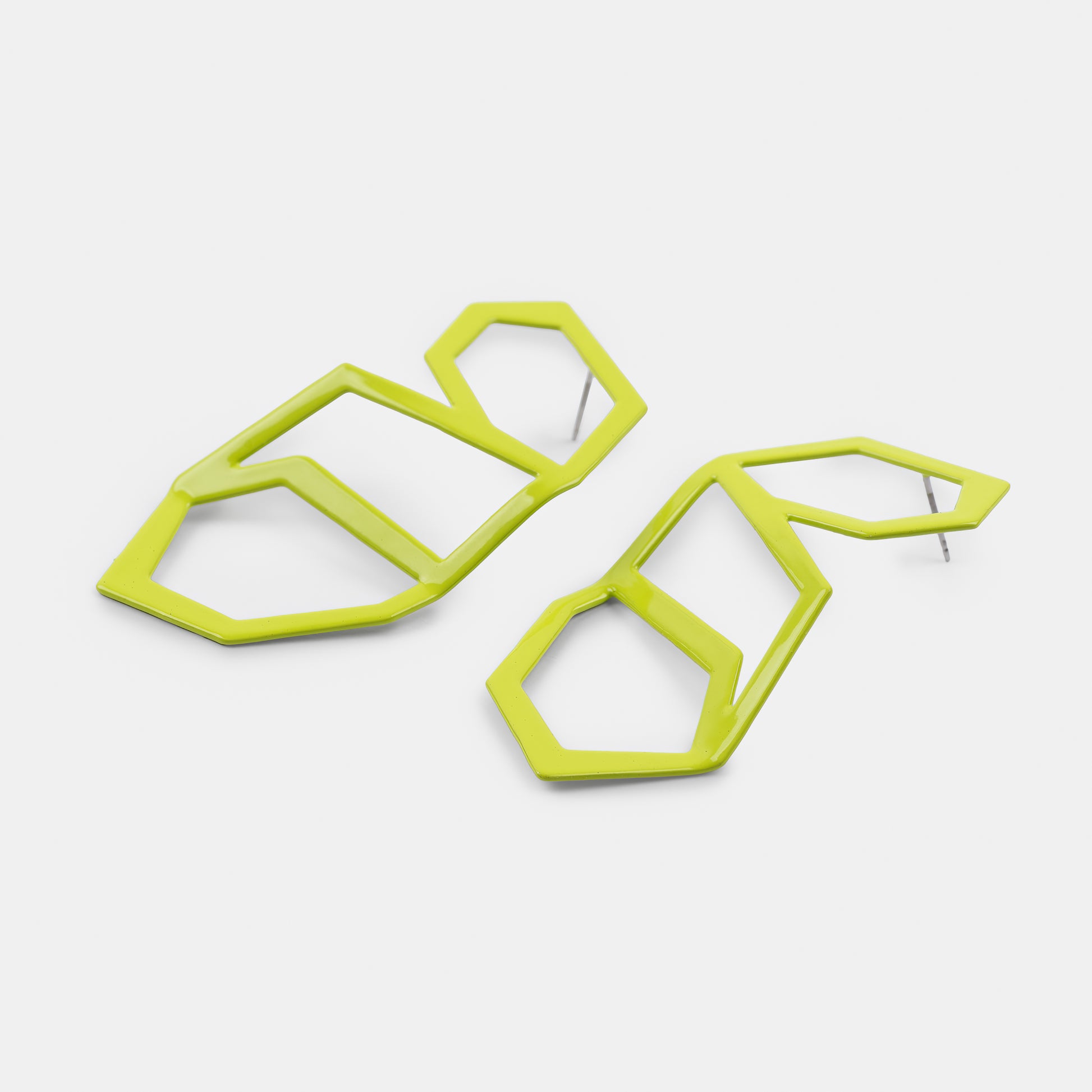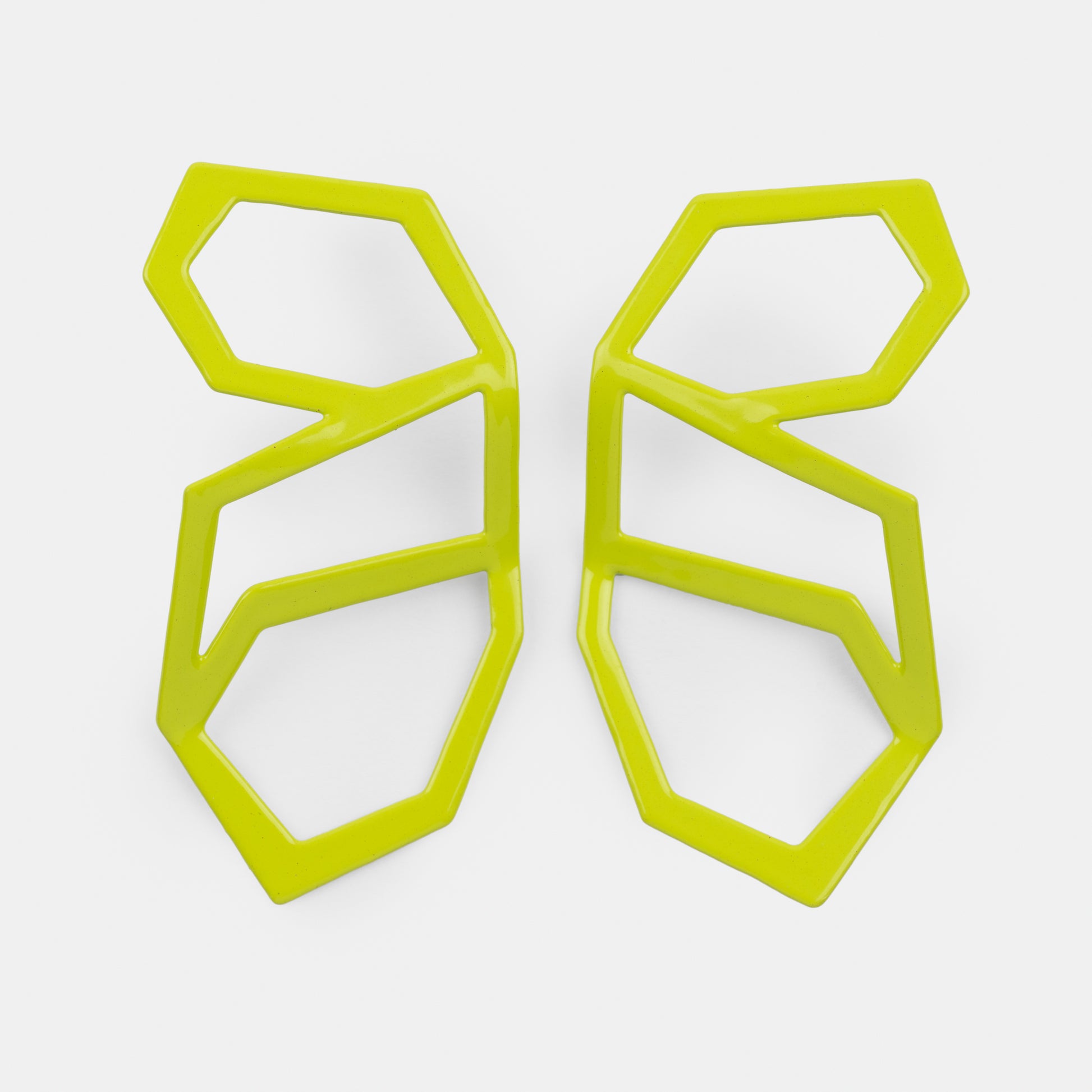 Chartreuse hand-dipped polyester powder coated, hand formed steel earrings with surgical stainless steel posts and sterling silver backings in the supported flight / wings shape