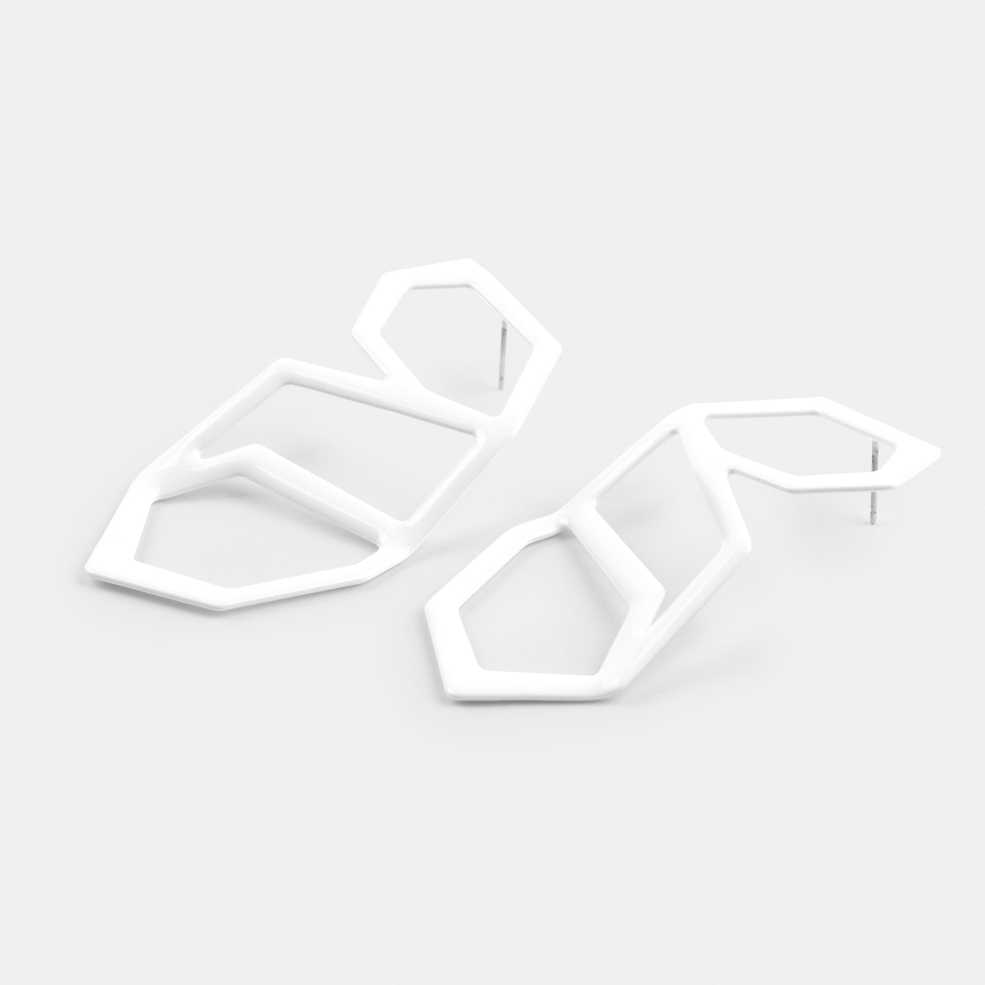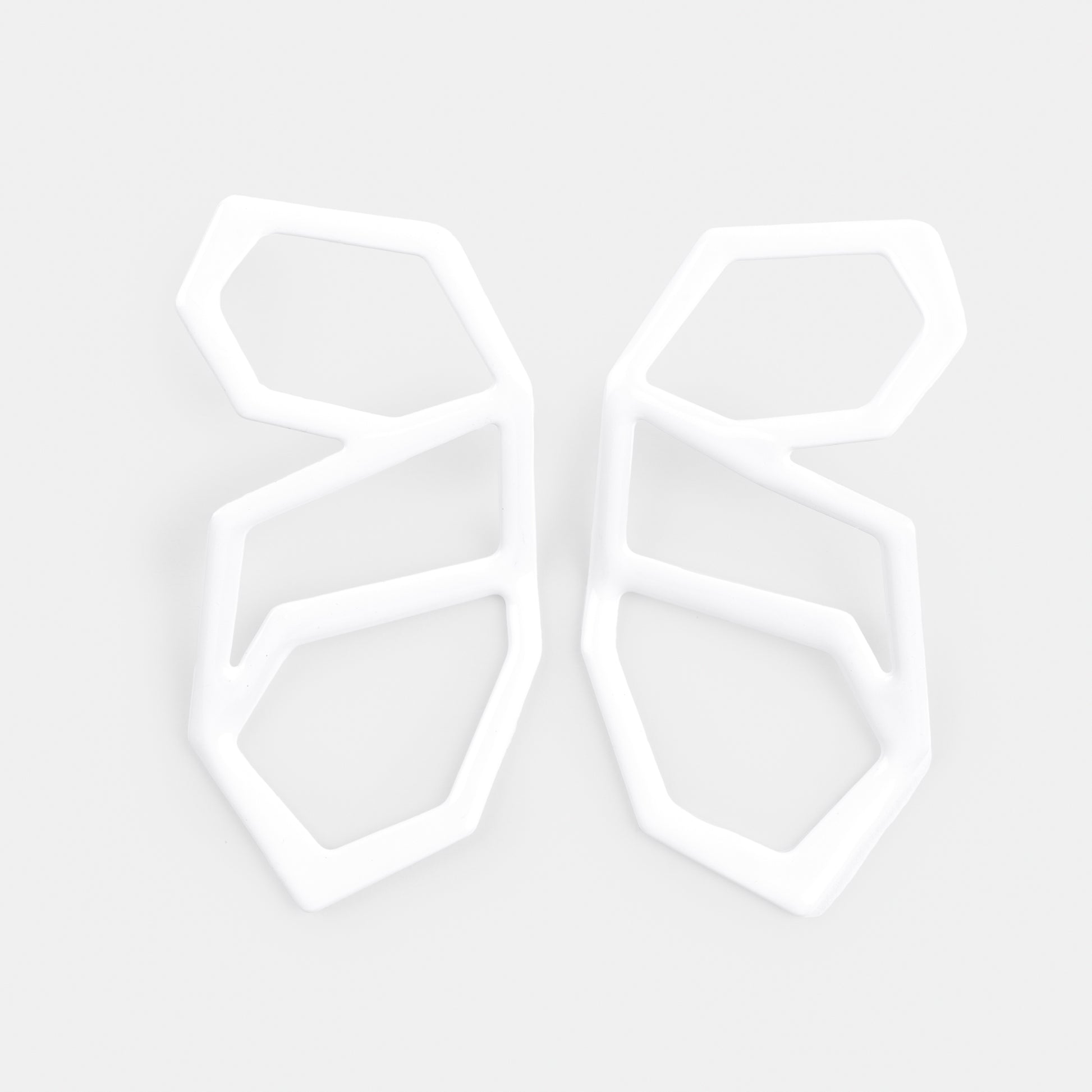 Cloud white hand-dipped polyester powder coated, hand formed steel earrings with surgical stainless steel posts and sterling silver backings in the supported flight / wings shape