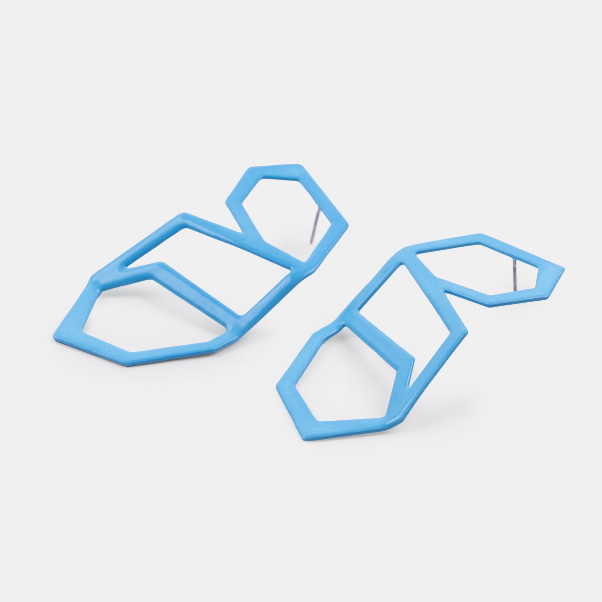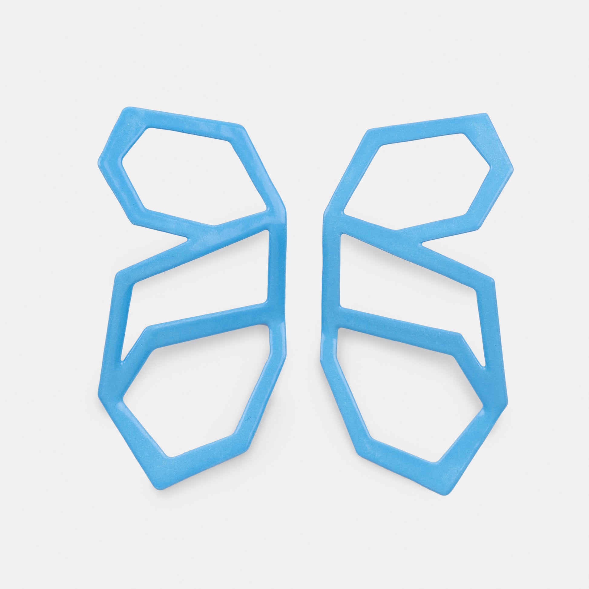 Screaming blue hand-dipped polyester powder coated, hand formed steel earrings with surgical stainless steel posts and sterling silver backings in the supported flight / wings shape